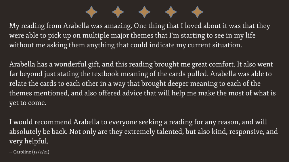 Tarot readings are a divination practice that provide wisdom and guidance through tarot cards and tarot card spreads. As an experienced intuitive tarot reader, I will use my skills to give you a intuitive, detailed and accurate tarot reading. Tarot readings are an amazing way to learn more about your life and path. My tarot card readings will give you clarity about your past, your present and the best way forward for your future.